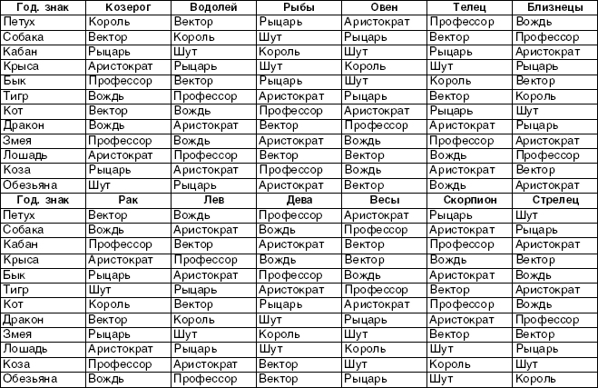 В дальнейшем, что хорошо видно из таблицы, по системе «плюс-минус» рождаются Шут (плюс-минус один), Рыцарь (плюс-минус два), Аристократ (плюс-минус три), Профессор (плюс-минус четыре), Вождь (плюс-минус пять).