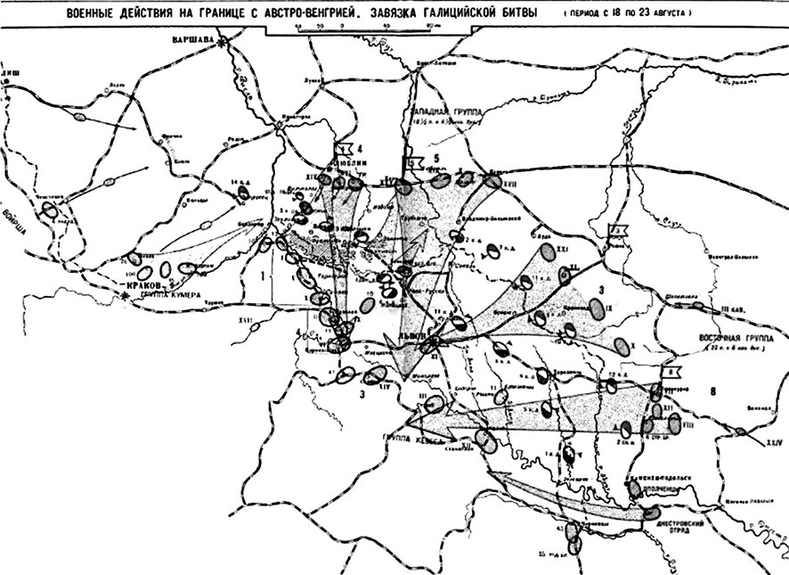 После объявления Австро-Венгрией войны России войска последней на Украине продолжали придерживаться обороны, что дало австрийцам повод подумать, что российские войска там слабы. 8—11 августа австрийская кавалерия силами трех дивизий атаковала русские позиции под Владимиром-Волынским с целью овладения этим пунктом. Австрийцы совершали лобовые конные атаки против русской пехоты прямо в стиле Наполеоновских войн. Потери австрийской стороны оказались огромными, во много раз превосходящими русские. Как затем выяснилось, Генштаб Австро-Венгрии не подозревал о существовании на Западе Украины 8-й русской армии[13], эта ошибка австрийских стратегов могла бы им дорого стоить, если бы русская армия сразу предприняла наступление после объявления Германией войны, но штабисты в Санкт-Петербурге считали вслед за французами главным театром боевых действий Восточную Пруссию. Официальный Париж рассматривал наступление против австрийцев второстепенным шагом, в чем были убеждены Парижем русские стратеги[14]. Чтобы задуманное Жоффром в 1912 г. французское наступление против Эльзас-Лотарингии было успешным, русские должны были сковать в Восточной Пруссии немецкие войска[15]. Хотя, точности ради, скажем, что инициатива наступления в случае конфликта с Германией исходила от Пуанкаре[16].