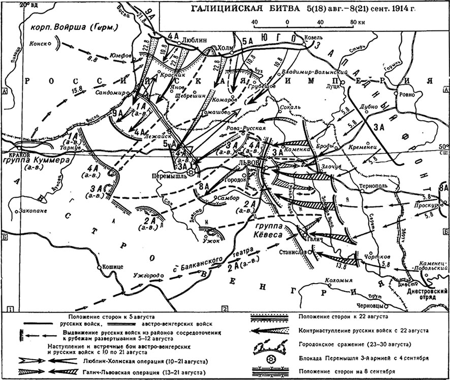 Рис. 2. Боевые действия в Галиции в августе 1914 г. «Галицийская битва». Российская версия