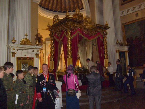 Паломники подошли к арке помолились перед иконой, которая висела на ней, перекрестились и пошли дальше к Собору, который ослеплял их глаза своей красотой и великолепием форм в архитектурном исполнении. Слов нет, это надо видеть своими глазами. Здесь располагался мужской монастырь. На территории монастыря разбит парк, проложены дорожки и памятники священникам к их могилам. Много деревьев и цветов на клумбах. Народу мало. Зашли в Собор, внутри просторные палаты, красиво разрисованы своды и стены. Много висят святых икон на стенах. Весь в золоте иконостас. Справа от иконостаса стоит гробница Александра Невского, где хранятся его Святые Мощи. Стоит небольшая очередь к гробнице. Идёт служба, которую ведёт архимандрит Ставропольский со своей духовной свитой. Все одеты в золотых ризах. Сказка, а не служба. На службе много казаков в различных званиях. Иван спросил у охранника: