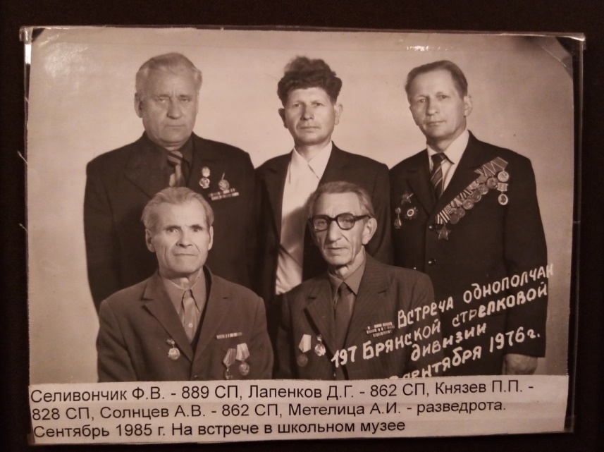 Спустя пятнадцать лет, в середине января 2021 года, я поехал устраиваться на работу в Брянск. Воспользовавшись случаем, побывал в государственном краеведческом музее. Была метель и много снега. Чтобы от съёмной квартиры добраться до музея, пришлось ехать с двумя пересадками. К тому же в городе из- за снегопада и гололёда были пробки. Экскурсия в музее мне понравилась. После общения с сотрудниками я хотел отдать в их фонды документы на моего дедушку И.С. Назаренко, который воевал в 197-й стрелковой дивизии и освобождал Брянск, но они категорически отказывались принимать копии, требуя безвозмездной передачи оригиналов документов и его наград, что в принципе невозможно. Ведь при обращении в любой архив, в том числе в ЦАМО РФ, вам не выдадут оригинальные документы из фондов, их можно получить только в виде копий. Тем более я отказался отдавать награды деда как человек, ценящий его память. Поэтому из музея ушёл с тяжёлым сердцем. Перед уходом я поговорил с библиотекарем музея, которая посоветовала мне обратиться в 36-ю школу, заверив, что там мои документы с удовольствием примут. Так как я и сам собирался зайти в эту школу, после посещения краеведческого музея заехал в фотостудию, сделал в цвете фото деда и его наградной лист, и отвёз всё это в музей 36-й школы. Елена Ивановна с радостью приняла мои документы, пообещав, что 9 мая расскажет и покажет детям информацию о нем. На фотографии в музее я увидел человека по фамилии Саливончик; подпись на фото говорила о том, что он приезжал на встречу с сослуживцами. На информационном ресурсе «Память народа» наградной лист Ф.В. Саливончика помещён сразу за наградным моего дедушки.