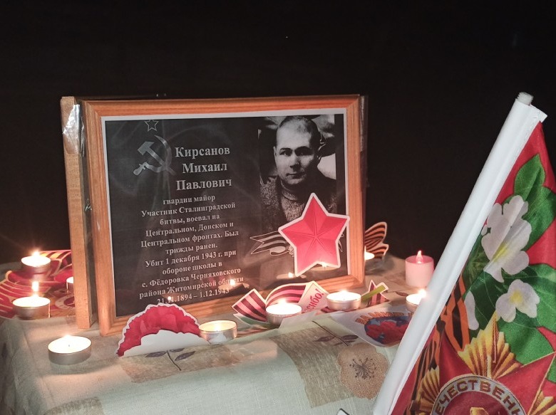 Вечером поехали во Дворец культуры на концерт под названием «Ни шагу назад!», куда нас пригласил Константин Борисович. Как и обещал организатор концерта, в ходе мероприятия слайды с информацией о моих родственниках Кирсановых транслировались на экран. Так была увековечена их память накануне 9 мая. После мероприятия нас пригласили на ужин, за что большая благодарность и низкий поклон Константину Борисовичу и его жене Светлане. В компании участников концерта из рокклуба «Нити» время пролетело незаметно. И вернулись мы в дом Александра уже поздно ночью, но с массой положительных эмоций. В праздник я тоже решил увековечить память Кирсановых – участников войны. Для этого накануне я попросил Светлану распечатать слайды из презентации. Также после прогулки по городу мы купили фоторамки. Их использовали для создания мемориальной композиции, дополнив её тематическими наклейками, свечами и флажком.