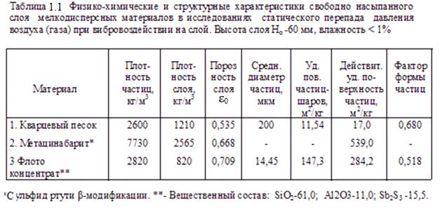 Предварительно определили для исследуемых материалов: плотность частиц, плотность и порозность свободно насыпанного слоя, средний диаметр частиц, удельные поверхности частиц (шарообразной формы и действительную), а также их фактор формы. Применили известные методики [3 – 8]. Результаты измерений физических и структурных характеристик частиц и слоёв материалов изложены в таблице 1.1.