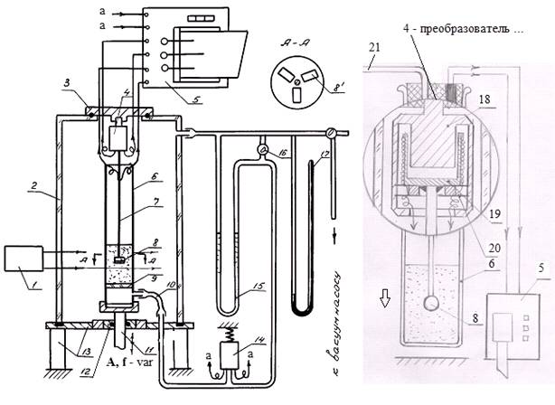 Систему: цилиндр, герметичная пробка с трубкой 21 и преобразователь колебаний слоя со штоком и зондом применили затем для измерения собственных колебаний свободно насыпанного слоя мелкодисперсного материала в разных газовых средах в низком вакууме (см. рис. 1.9, справа).