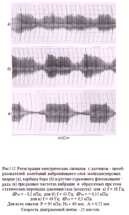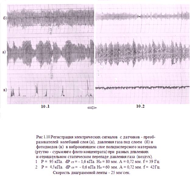Результаты записей осциллограмм виброкипящих слоёв полидисперсных материалов и прохождения пузырей газа в слоях при атмосферном давлении воздуха и в низком вакууме при положительном и отрицательном статических перепадах давления газа (воздуха) на слое приведены на рисунках 1.10 – 1.12.