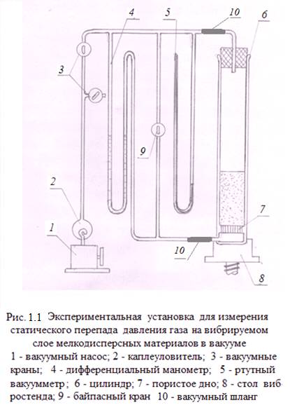 Схема экспериментальной установки для измерения статического перепада давления на вибрируемом слое мелкодисперсных материалов при давлении воздуха (газов) меньше атмосферного (в низком вакууме) приведена на рисунке 1.1.
