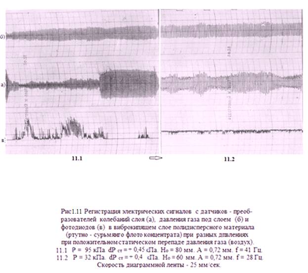 Визуальные наблюдения слоя полидисперсного материала в вертикально-вибрируемом прозрачном цилиндре при давлении газа в слое, меньшем атмосферного, позволили установить четыре гидродинамических режима: виброожижение (уплотнение), сегрегацию (переход к виброкипению),