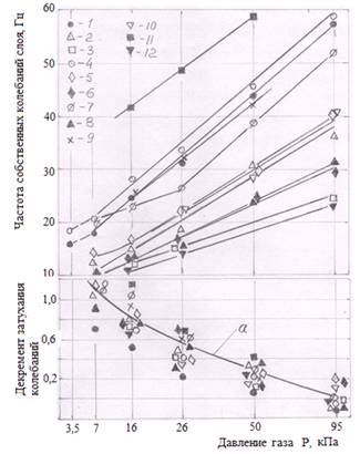 Декремент затухания колебаний ϑc в незначительной степени зависит от высоты слоя, материала частиц и рода газа и увеличивается при уменьшении давления: