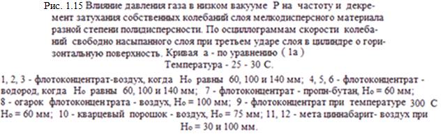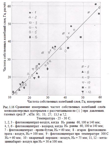 Обработка большого числа экспериментальных данных, приведенных на рисунке 1.15, показала, что для слоев полидисперсного кварца, метацинабарита, флотоконцентрата и его огарка в воздухе, водороде и пропан – бутановой смеси частота собственных колебаний fc в зависимости от порозности слоя ε равна: