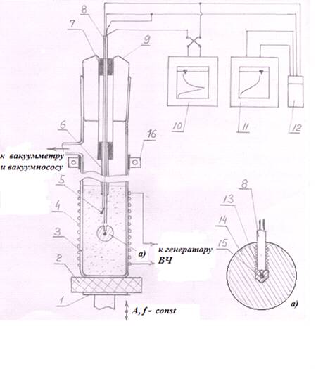 расположенный на 25 мм от дна вертикально-вибрируемого цилиндра и жестко соединенный с герметизирующей пробкой, рисунки 1.17 – 1.19. Быстрый нагрев шара 14 в неподвижном слое осуществляли высокочастотным электромагнитным полем катушки 4, коаксиальной боковой поверхности цилиндра. Включив вибростенд с заранее установленными параметрами вибрации затем регистрировали убывающую во времени разность температур в центре охлаждаемого шара и в слое θ = ψ (τ). Коэффициент теплообмена определяли по формуле [12]: