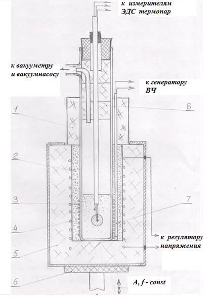 При измерении статического перепада на виброслое при температурах до 500 0С цилиндр 6 с материалом нагревали в трубчатой электропечи, установленной над столом вибростенда осесимметрично цилиндру. Температуру в центре слоя измеряли термопарой ХК, показания которой преобразовывали на потенциометре с точностью +– 5 0С.