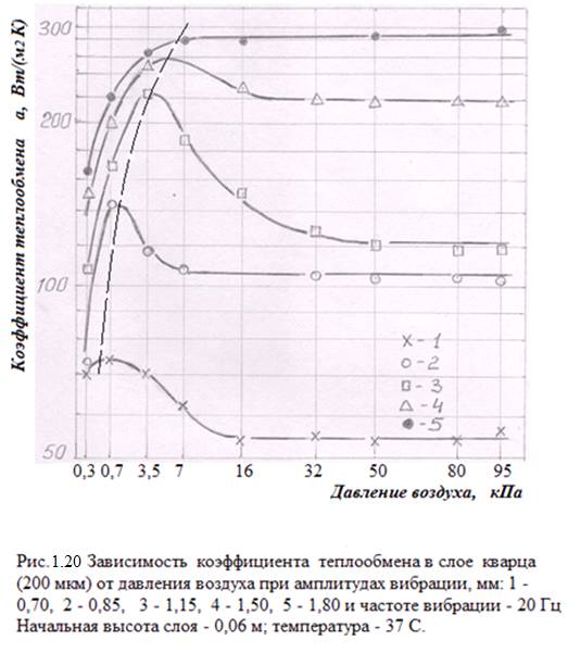 Исходя из представлений пакетной теория теплопереноса и зависимости теплопроводности пакета от теплопроводности газа, разработана методика экспериментального определения критерия Кнудсена для меж зернового пространства вибрируемого в вакууме слоя мелкодисперсного материала. С использованием данных α ( Р ) для слоя мелкодисперсного кварца в различных газовых средах установлено, что размер теплопередающего газового промежутка между частицами в вибрируемом слое меньше характерного размера поры и линейно возрастает при увеличении коэффициента динамической вязкости газа. Результаты применены для объяснения особенностей теплопередачи, см. рисунок 1.22, в слое ртутно-сурьмяного концентрата при Р < 0,6 – 1,4 к Па, [13].