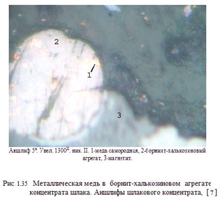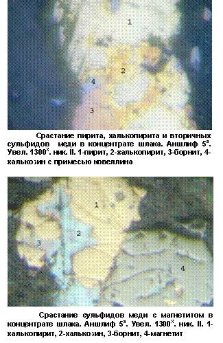 Однако, как удалось установить, минералогический анализ шлаковых концентратов показывает на наличие в них преимущественно следующих форм меди: низшего сульфида – халькозина (Cu2S) и высших: ковеллина (CuS), халькопирита (CuFeS2) и борнита (Cu5FeS4) с примерным соотношением по меди 1 : 1 : 2.