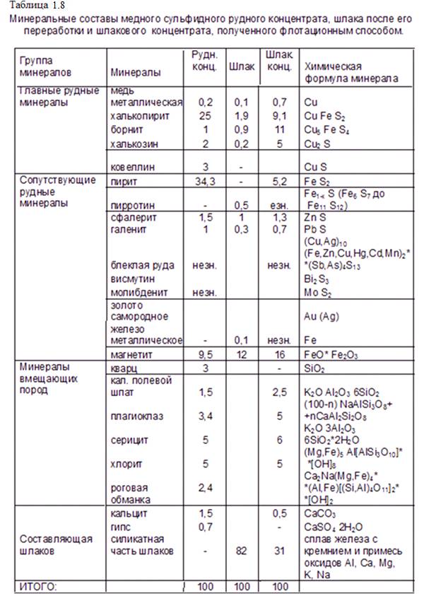 Подробный минералогический анализ проб рудного и шлакового концентратов, а также шлака, позволил составить таблицу минеральных составов этих продуктов (таблица 8). Отметим близкое совпадение данных этой таблицы с рациональными составами рудного и шлакового концентратов, полученных химическим и фазовым анализами, табл. 1.7.