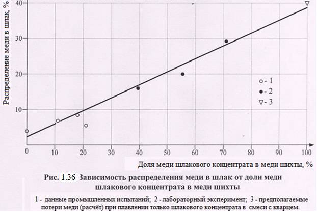 Прямая переработка рудного концентрата в смеси со шлаковым приводит к росту потерь меди с «вторичными шлаками». Это хорошо видно по результатам плавок, приведенных на рисунке 1.36.