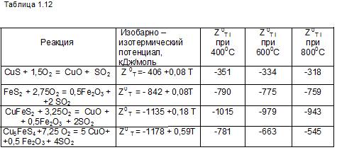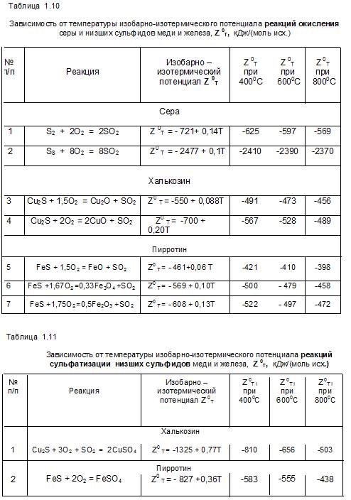 Низшие сульфиды меди и железа, это: халькозин Cu2S, пирротин FeS и штейн Cu4FeS3 = 2Cu2S + FeS, как сумма двух низших сульфидов разных металлов. Термодинамические расчёты реакций окисления и сульфатизации низших сульфидов приведены ниже, таблицы 1.10 и 1.11.
