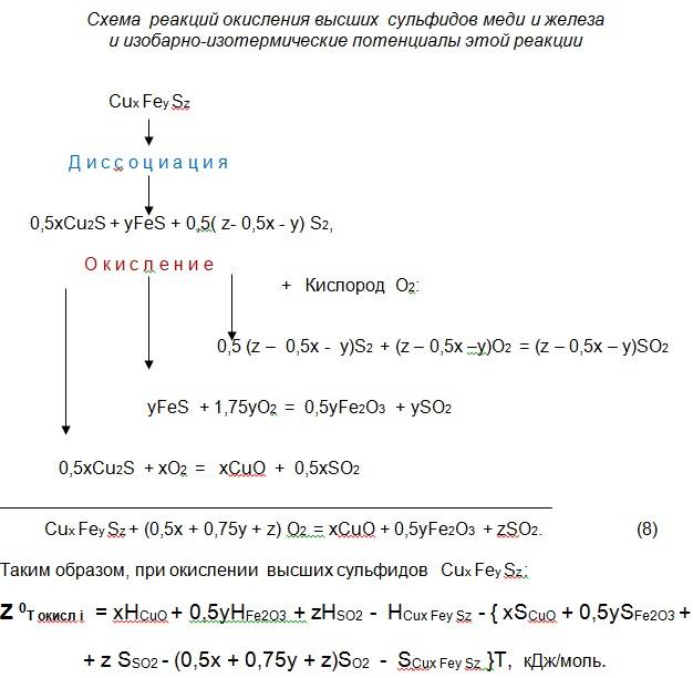 7. Хотя на вывод 6 может наложить поправки кинетика процессов сульфатизации и окисления сульфидов меди и железа, необходимо уже сегодня, по нашему мнению, ввести понятие сортности высших сульфидных медных концентратов и декларировать её снижение с ростом в них массовой доли меди и железа и увеличением содержания в шихте для плавки таких высших сульфидов.