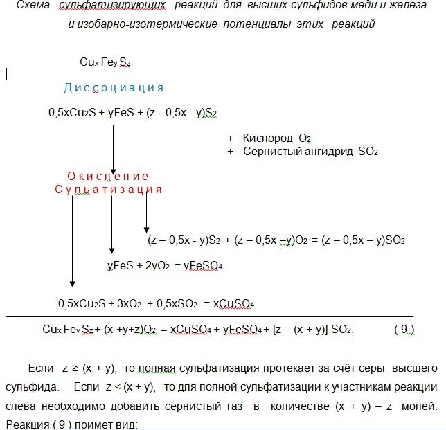5. Если количество атомов серы в молекуле сульфида z равно или больше сумме атомов меди и железа (х + у), то полная сульфатизация протекает за счёт серы высшего сульфида. Если z < (х + у), то для полной сульфатизации к исходным участникам реакции необходимо добавить сернистый газ в количестве [(х + у) – z] молей/моль исх.