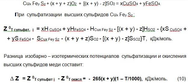 Кроме этого, приведенное уравнение (В.1) показывает, что наименьшая вероятность сульфатизации (в сравнении с окислением) – у ковеллина, пирита и пирротина, затем она повышается для халькозина и халькопирита и становится наибольшей для сложных высших сульфидов – борнита, идаита и других, а также низшего сульфида – штейна.