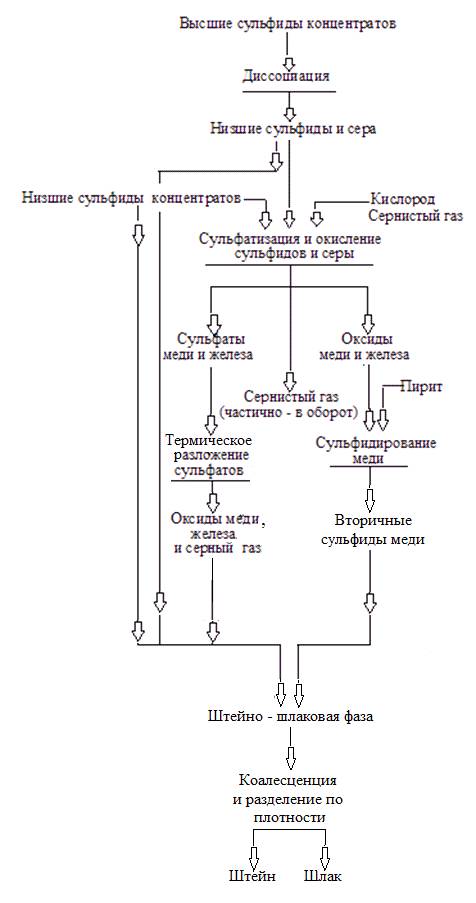 Выполненные расчёты позволяют предположить следующую технологическую схему окисления сульфидов меди и железа в медеплавильном производстве при избытке кислорода, рисунок 1.37.