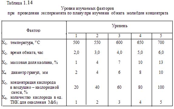 Исследование окисления молибденита в концентрате в гранулированном слое (с добавкой каолина) проводили методом математического планирования эксперимента. Выбрали пятифакторный эксперимент на шести уровнях. Уровни изучаемых факторов приведены в таблице 1.14.