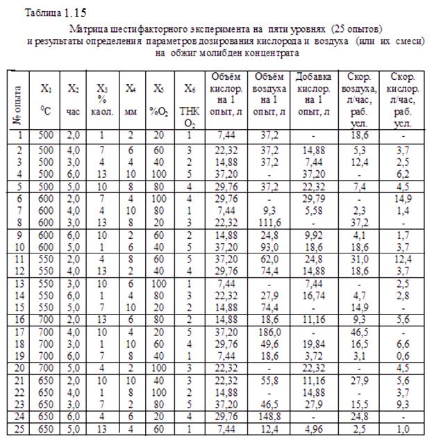 В соответствии с требованиями этого метода составили матрицу, приведенную в таблице 1.15. Для определения расхода кислорода и воздуха на обжиг согласно плану выполнили расчёты, в которых сначала определили необходимые объёмы окислителей (чистого кислорода и, отдельно – кислорода воздуха) затем, исходя из заданного времени окисления, определили объёмные скорости кислорода и воздуха перед смешением для подачи в зону обжига. Результаты расчётов приведены в таблице 1.15.