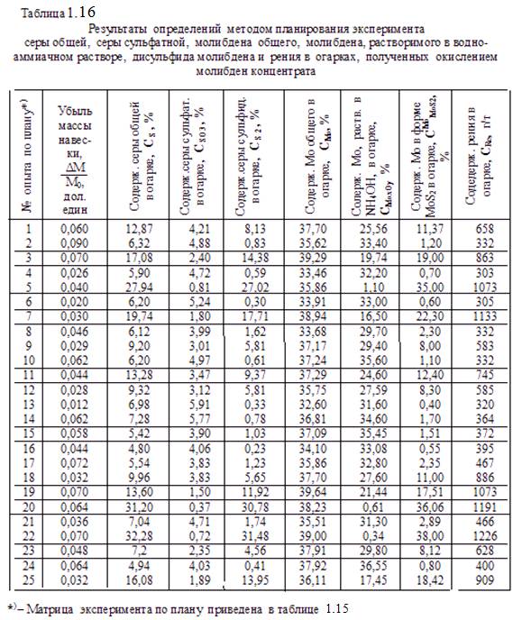 Результаты определений серы, молибдена и рения в огарках приведены в таблице 1.16. Обработка этих данных позволила установить: степень десульфу-ризации шихты, относительные потери молибдена в возгоны (газы и пыль), степень перевода молибдена в окисленные формы, растворимые в аммиаке, и степень перехода рения в возгоны.