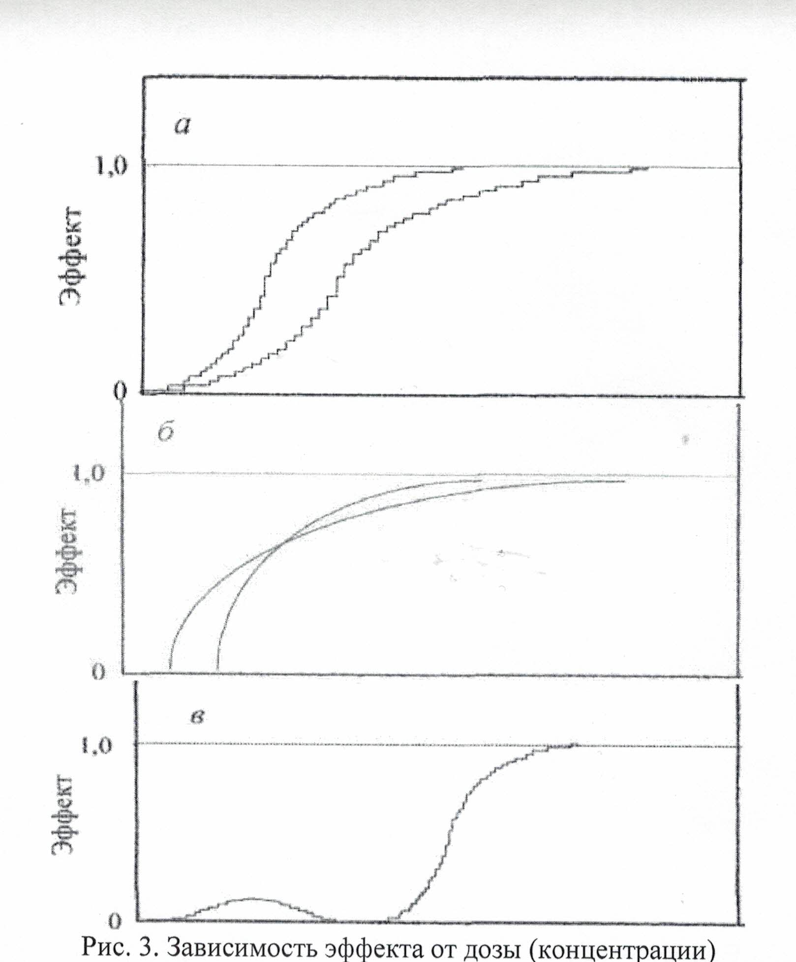 Все наблюдаемые варианты дозовых зависимостей (аппроксимационные кривые) распределены на три группы: S-образные кривые (а), показательные (экспоненциальные) кривые (б) и сложные зависимости (парадоксальные эффекты) (в) (рис. 3) [52].