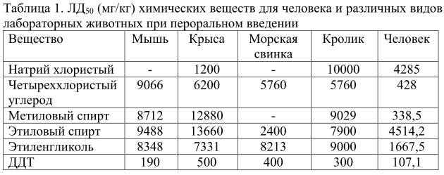 При прочих равных условиях для данного биообъекта токсичность вещества определяется его химической природой. Для иллюстрации приводим табл. 1, в которой представлены значения средних смертельных доз некоторых химических веществ для человека и лабораторных животных [46].