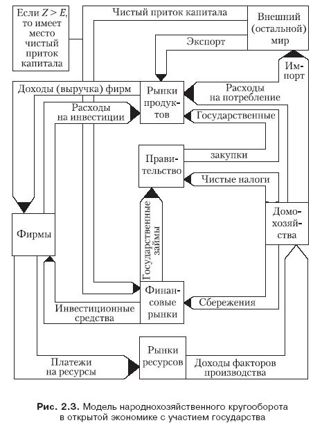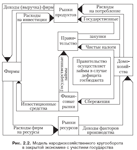 Основные потоки народно-хозяйственного кругооборота представлены в виде схем (рис. 2.1–2.3). В открытой экономике с государственным вмешательством из потока «доходы-расходы» происходят «утечки» и одновременно вливания дополнительных средств в виде «инъекций».