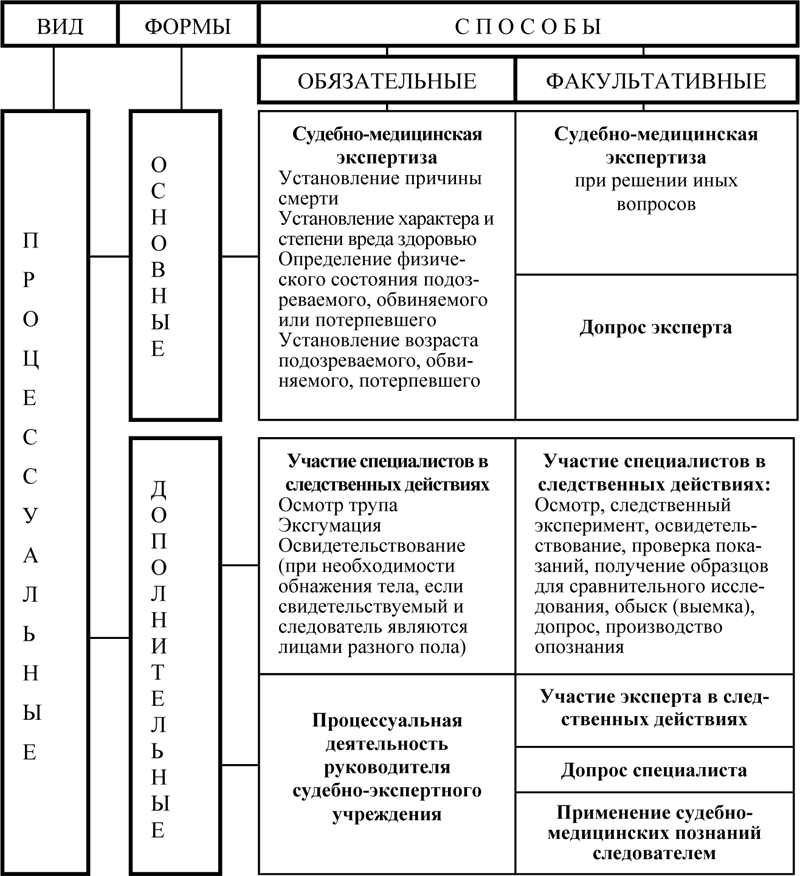 Перечисленные формы судебно-медицинской деятельности прямо предусмотрены и подробно регулируются соответствующими нормами УПК и (или) Закона «О государственной судебно-экспертной деятельности в РФ». При этом для каждого из них закон устанавливает процессуальную форму закрепления хода и результатов работы эксперта или специалиста – такими формами являются заключение эксперта и протокол следственного действия (осмотра, допроса, освидетельствования, предъявления для опознания и т. д.).