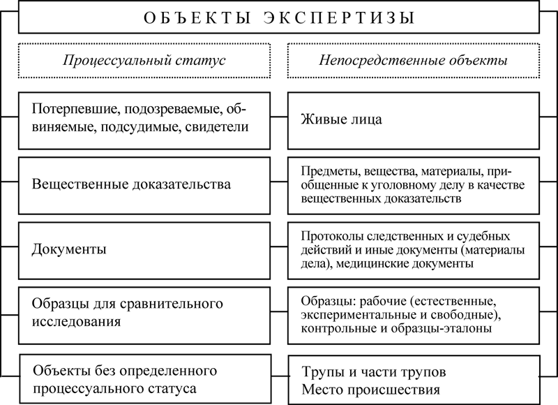 Поэтому следует различать непосредственные объекты судебной экспертизы, которыми являются конкретные люди, предметы, вещества, материалы, животные, место происшествия и содержащие о них сведения документы, а также объекты в соответствии с их процессуальным статусом (схема 3).