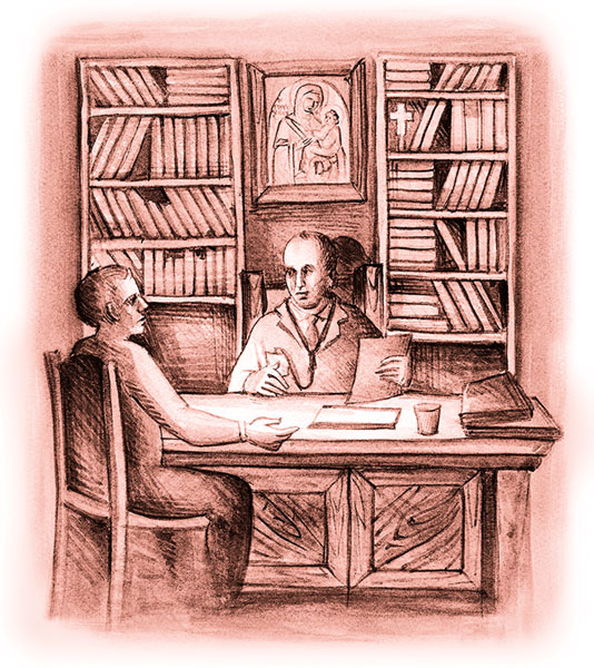 В этом разногласии и закончился наш обед. Я пошёл к себе, а он в больницу, чтобы осмотреть больного. Выходя из палаты (а коридор был забит носилками, к тому же, в этой больнице не было широких коридоров) и пытаясь перескочить от перил к перилам, он нечаянно опрокинул цветочный горшок на голову медбрата, который перевозил коляску этажом ниже, и оставил его потерявшим сознание. Сгорая от стыда, он вышел наружу, сел на ступеньки больницы и горько заплакал. Он стал думать: «Сегодня в полдень я хвалился тем, что никогда не позволял себе делать или предлагать аборт. Хвалился тем, что стоял рядом с больным до конца. Вот и ответ на сегодняшний разговор. Ах, отче, как же ты был прав!» И тогда он сказал себе: «Нет, пойду и признаюсь в своей ошибке, в своей невнимательности».