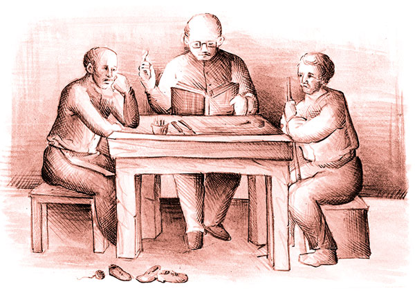 Оказалось, что он был сапожником и работал неподалёку. У него была маленькая лавочка, в которой он чинил старую обувь. В то время это было очень нужным занятием в бедных районах, у жителей которых не было возможности покупать себе новую обувь. Я смотрел на бедноту, которая постоянно заходила в лавочку Илии как в современный супермаркет. А поздним вечером вокруг стола, за которым Илия в своём белом фартуке сидел и чинил обувь, собиралось пять-шесть человек, которые слушали его чтение. «Так, – сказал я себе, – надо будет как-то вечером захватить туфли для починки и послушать их разговоры». Оказалось, что этот пожилой богослов читал Добротолюбие и изъяснял его своим благочестивым клиентам. На другой день, получив свою обувь, я поздравил сапожника с тем, что у него такие друзья.