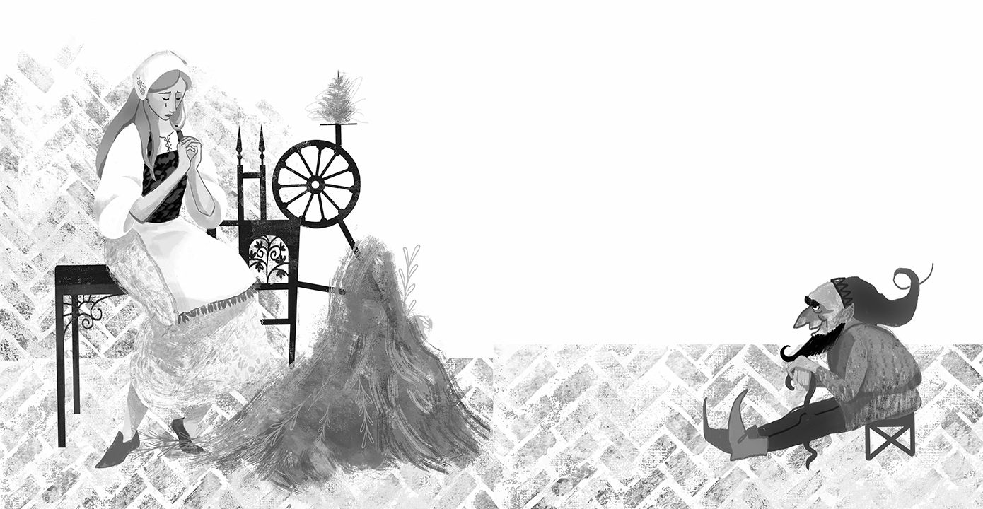 Und als das Mädchen kam, führte er es in eine Kammer, die ganz voll Stroh war, gab ihr Rad und Haspel und sprach: „Jetzt mache dich an die Arbeit, und wenn du bis morgen früh dieses Stroh nicht zu Gold versponnen hast, so musst du sterben“. Darauf schloss er die Kammer selbst zu, und sie blieb allein darin.