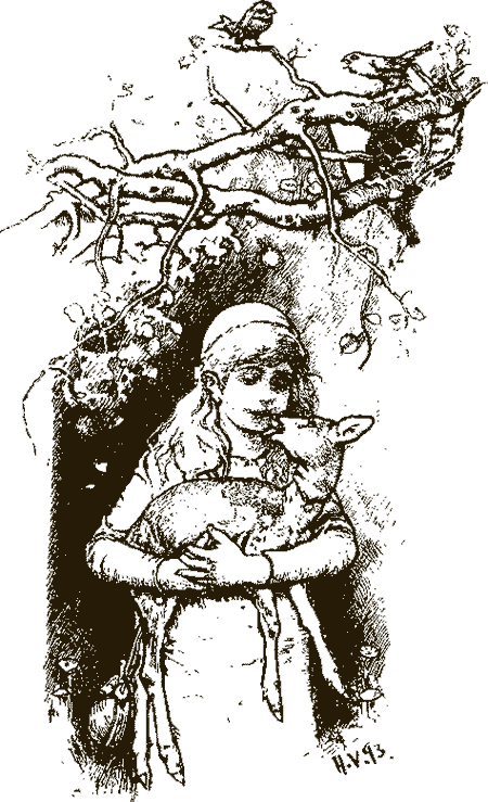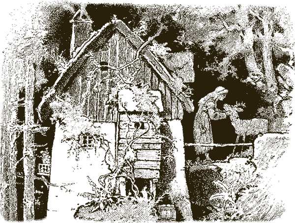 Набрала девушка листвы и мха и сделала козлику мягкую постельку. Каждое утро собирала она ягоды и орехи, а братцу приносила свежей травки. Козлик ел из её рук, прыгал вокруг неё, играя. Вечером, притомившись, сестрица, бывало, положит голову козлику на спину, словно на подушку, да так и уснёт. Так жили они в лесной избушке и были счастливы.
