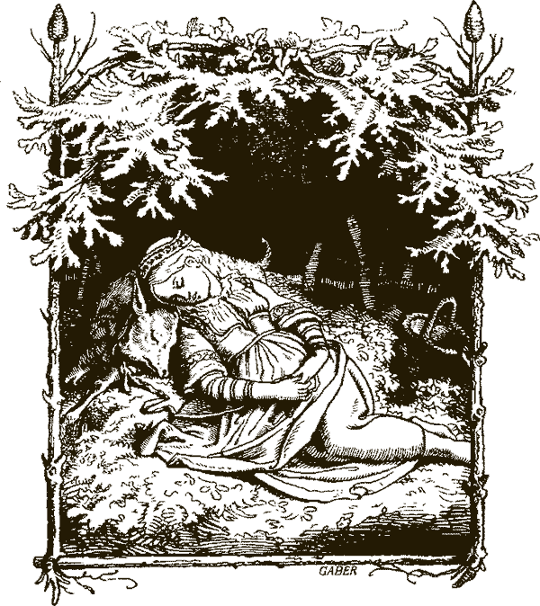Когда стемнело, прибежал козлёнок к домику, постучался и сказал: «Сестричка, впусти меня». Тотчас отворила девушка дверь брату, впрыгнул козлик в комнату и лёг отдыхать на ложе из листвы и мха.