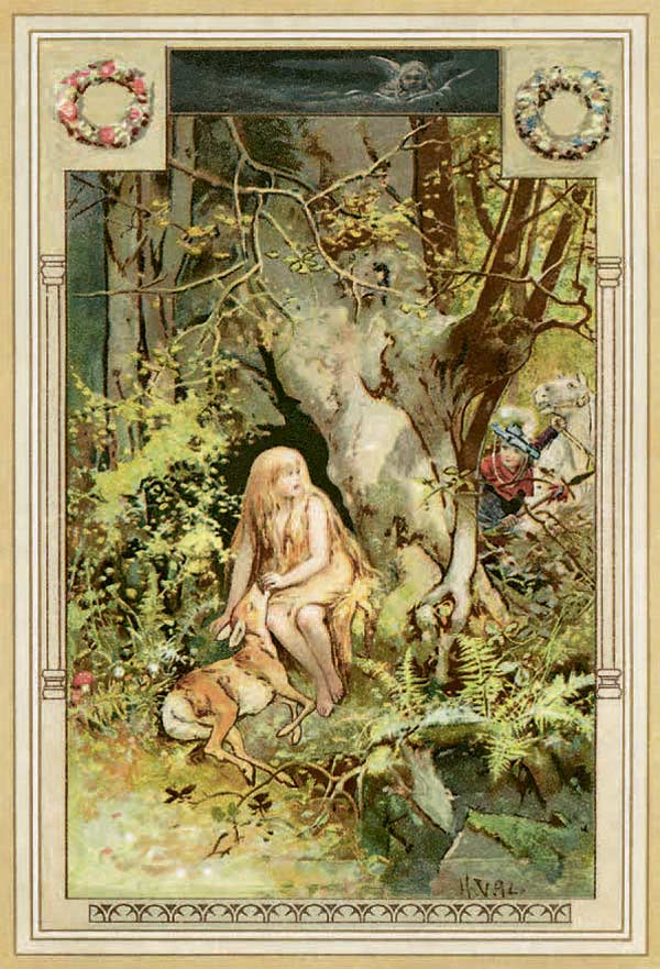 А когда солнце зашло, государь приказал егерю, что накануне следил за необычным козликом, показать лесную избушку. Постучал король в дверь домика и молвил: «Сестричка, впусти меня». Дверь отворилась, и государь увидел девушку невиданной красоты. Испугалась девушка, но король ласково протянул ей руку и сказал: