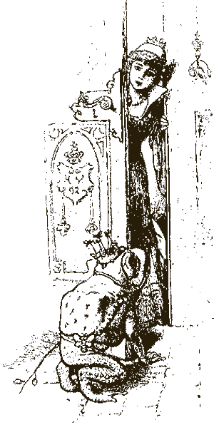Вскочила девушка и, отворив дверь, увидела за ней лягушонка. Испугалась она, быстро захлопнула дверь и вернулась к столу. Но король заметил, что с дочерью творится неладное, и спросил:
