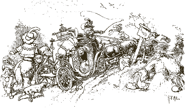 Наутро подъехала к крыльцу карета, запряжённая восьмёркой белых лошадей. Сбруя коней была вся из золотых цепей, украшенная плюмажами из белых страусовых перьев. На запятках кареты стоял верный слуга королевича. Звали слугу Генрих.