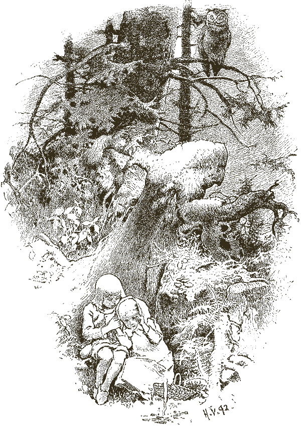 Гензель и Гретель сидели у огня, и когда наступил час обеда, съели свои кусочки хлеба. Они слышали удары топора и думали, что отец неподалёку. Но стучал не топор, а раскачиваемый ветром сухой сук, который мачеха привязала к дереву. Долго сидели Гензель и Гретель, глаза у них стали слипаться от усталости, и в конце концов они заснули. А когда открыли дети глаза, была ночь.