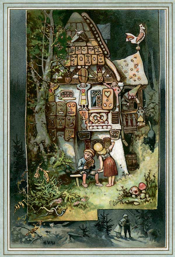 Но Гензель продолжал останавливаться: он раскрошил свой кусок хлеба и разбрасывал вокруг вместо камешков хлебные крошки.