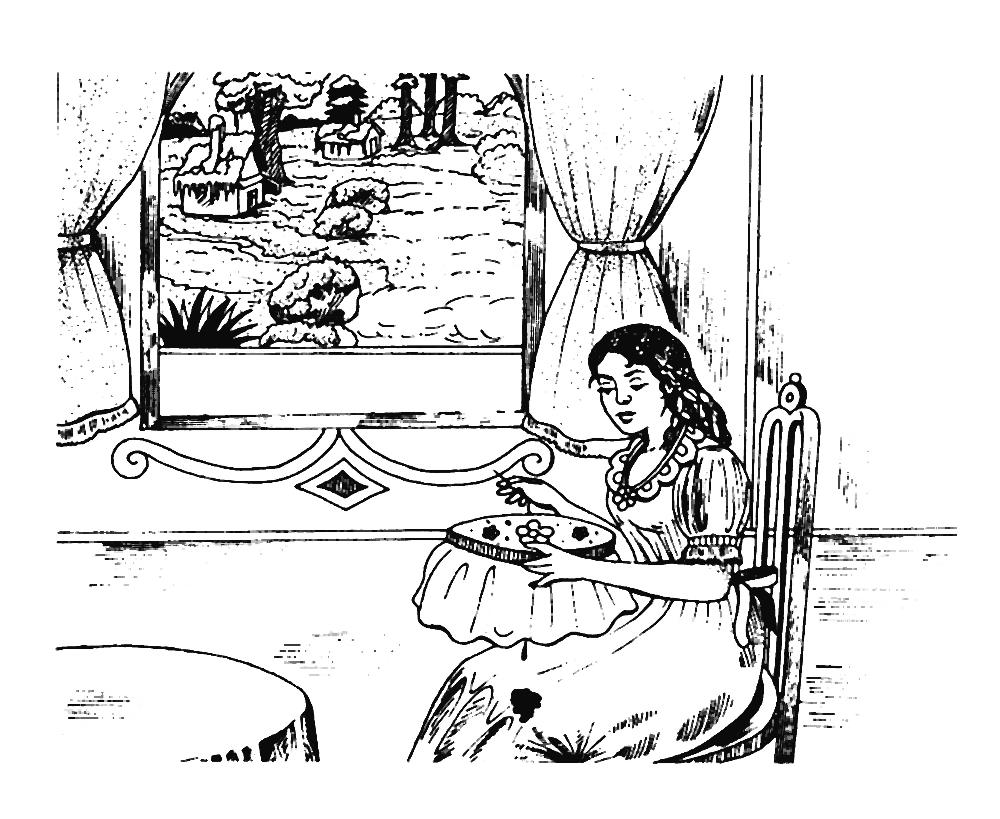 Snow White was very hungry. She had been walking and running the whole day without food. Now she ate a piece of bread from each plate and drank some milk from each cup. She sliced and ate the cheese that she found in the centre of the table.