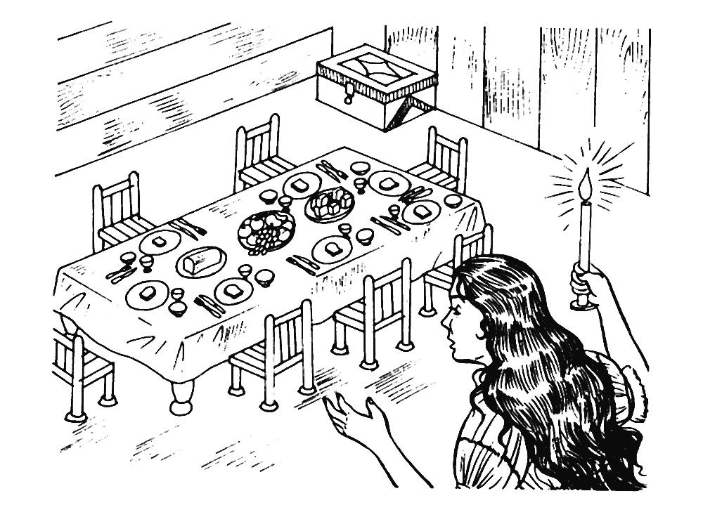 She knocked at the door. No one answered. But the door was open, so she pushed it and went inside. It was very dark. She found some candles and matchsticks. She lit a candle, raised it above her head and looked around.