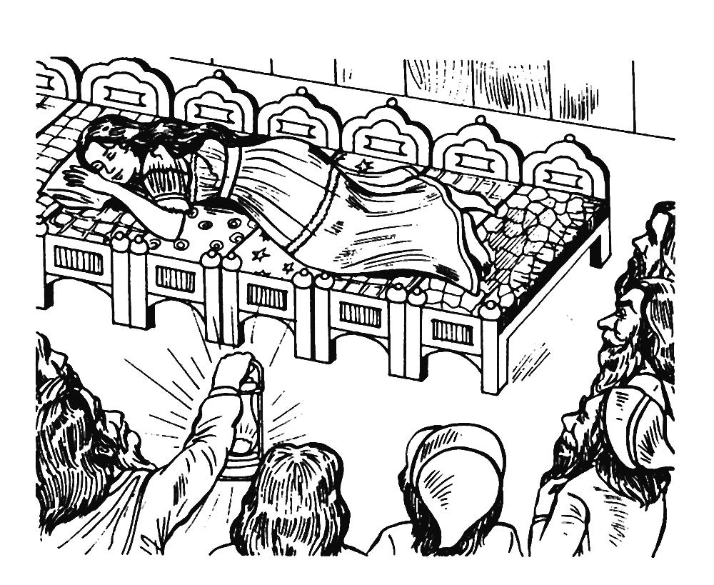 “Now, let me see what’s upstairs,” she said, and climbed the steps. There, she found seven beds neatly made up. She sat on one and found it very comfortable. She was exhausted, so she put the candle on the table, lay down across the seven beds and soon fell asleep.