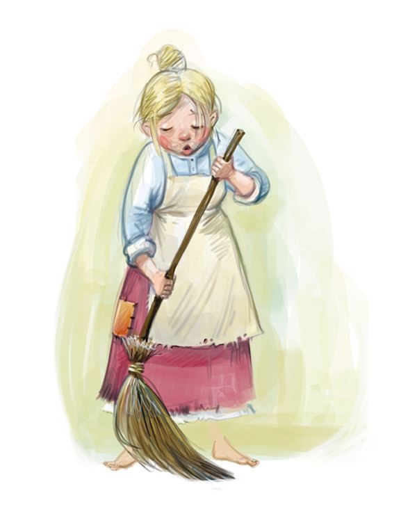 Вечером, когда она от работы уставала, ей приходилось ложиться спать не в постель, а на полу, рядом с печкой, на золе. И оттого, что была она всегда в золе, в пыли и грязная, прозвали её сёстры Золушкой.