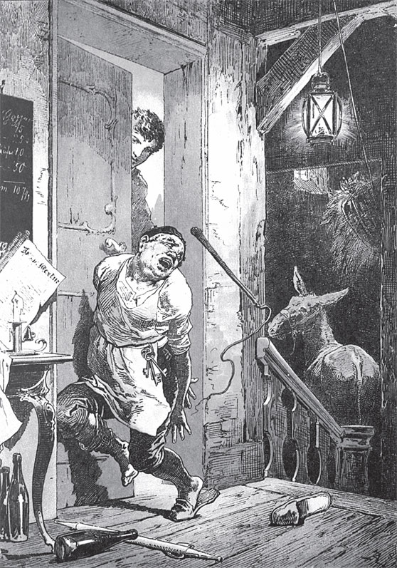 А токарь давно уже только этого и поджидал, и в то самое время, когда хозяин собирался дернуть мешок посильнее, он воскликнул: «Дубинка, из мешка!» И тотчас же дубинка выскочила из мешка, наскочила на хозяина и давай его по всем швам разделывать! Хозяин стал кричать и молить о пощаде; но чем громче он кричал, тем сильнее выбивала дубинка в такт этому крику дробь по его спине, пока, наконец, он не упал в совершенном изнеможении.