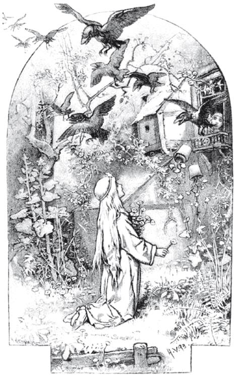 И очутилась бедная девочка одна-одинешенька в диком лесу, и когда стала оглядываться кругом, то увидела рядом старуху, которая ей и сказала: «Дитя мое, что ты это наделала? Зачем ты сорвала эти двенадцать белых лилий? Ведь эти цветки были твои братья, и вот теперь они навек обратились в воронов».