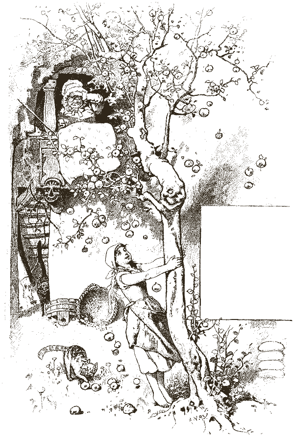 Затем увидела девушка яблоню, та ей: «Потряси меня, потряси поскорее! Яблоки на мне давно уж созрели!» Но лентяйка отвечала: «Очень мне надо! Пожалуй, ещё какое-нибудь яблоко мне на голову упадёт!» – и пошла своей дорогою.