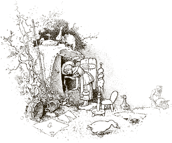 С одной стороны она на дерево влезла, с другой стороны спрыгнула, вернула свой наряд птичке, что сидела на орешине, надела старые лохмотья и вернулась домой к куче золы у очага.